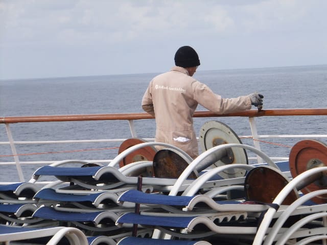 下記は、太平洋横断、ノロ消毒にあけるクルー。手袋必携。