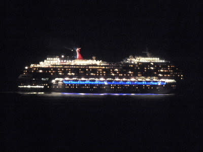丁度、カーニバルの船が、横を走る。ものすごい明るさだ、こちらはあまり照明なく
