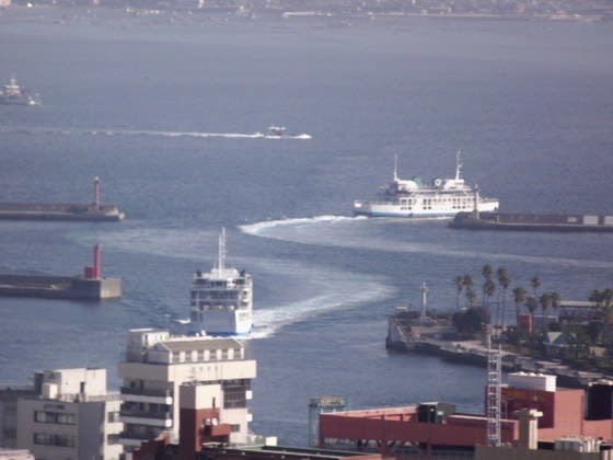 ③城山からの桜島フェリーの行き交う様子です。
