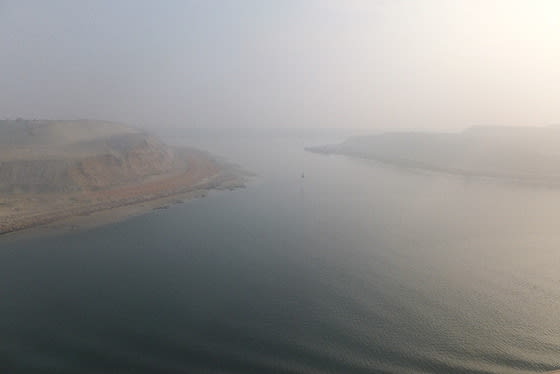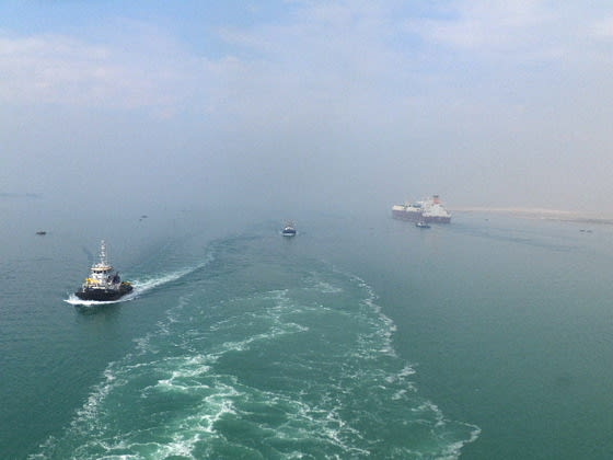 本日朝は深い霧、船は警笛をひたすらならし、スエズを進む。