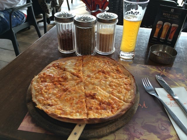 街の警官は、マシンガン、なんとも物騒な国だ。日本人いない、1人ピザを食べる。