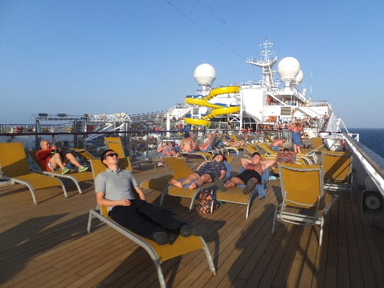 最上階近いデッキは、冬の欧州からこの太陽を求めて乗船してきた人が水着で1日