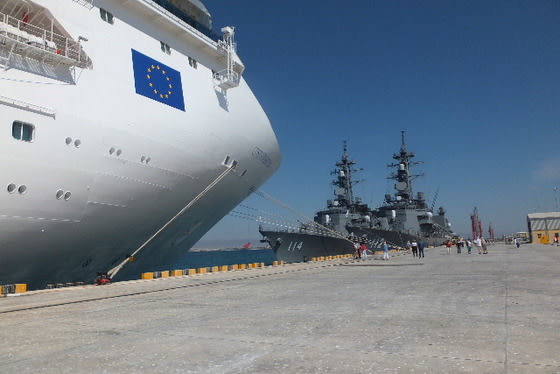 今日は、異国の地で、とうとう海上自衛隊の二隻の軍艦となんと同じ桟橋に