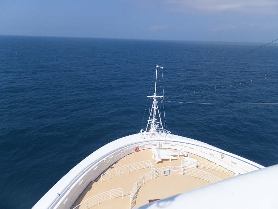 ![](embed:photo/79195) なんか1時間前から、雨止み、波も静か、 明日到着予定が、もう伊豆の大島沖縄か?、 あと四時間くらいで横浜大桟橋。 台湾から 22ノット高速航行。もう大桟橋は近い。 大画面液晶ビジョンの前にも人はいな