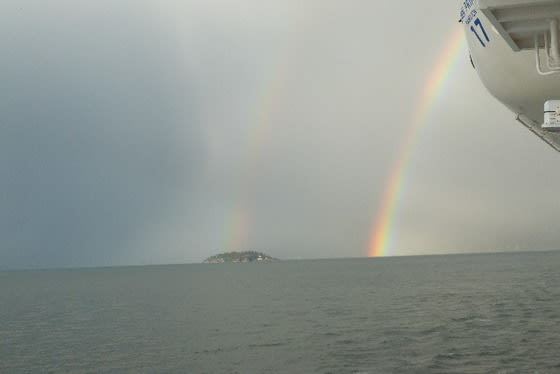 雨の様子伺い上陸予定。滞在時間朝7時➡午後3時半 All Aboard 3時。