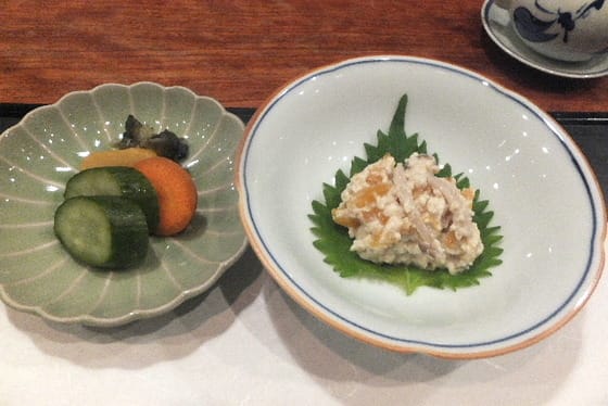 先ずは、海外では食べられない「お新香」と「柿の白和え」