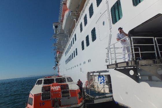 この日は、大型客船の停泊できる港も桟橋もなく、テンダーボート(通い船)による上陸となつた。こんな小さな船だが、五十人は乗れる船である。