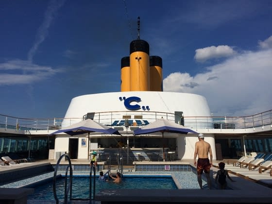 > ぼるキャビ様 雨と思いました、よき出港となりました。コスタの黄色いファンネルが青い空によく映えます。波も静かです。