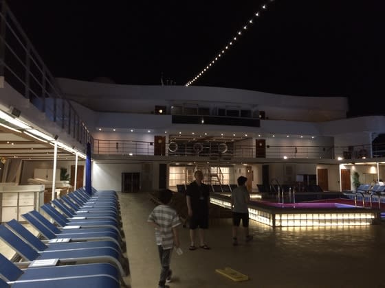現在は、11階、夜食のバッフェ横のプールサイド。