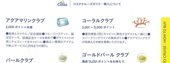 コスタクルーズも下記の通りのリピータープログラムの「コスタクラブ」がある。