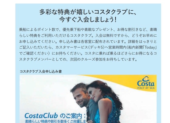 > ito*****様 まあ将来換り良くなるかもしれません。コスタはリピーターでも、入会の申込みしないとコスタクラブ入れません。まあ今度乗船したら、入会してみて下さい。