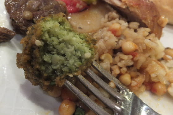 スプーンに刺してあるのは、「ターメイヤ」と言う、そら豆の野菜コロッケ。
