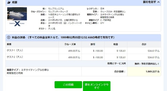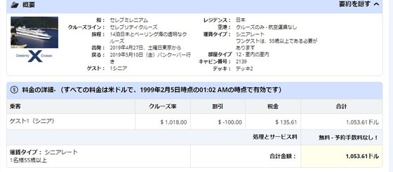 1人の料金、クルーズ代金港湾税込で、 534.61ドル。