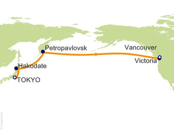 航路は、横浜を4月27日出港、函館、ロシアのペトロパブロフスク・カムチャッキー、カナダのビクトリアに寄港して、最終寄港地カナダのバンクーバーに5月10日に到着の14泊15日。勿論三食、イベントショー付き。