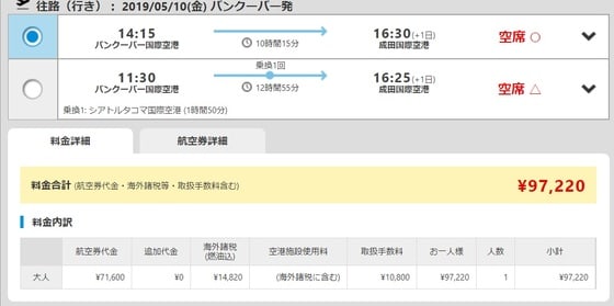 その値段は、片道バンクーバーから成田の見積もりは、エアトリで見てみた。