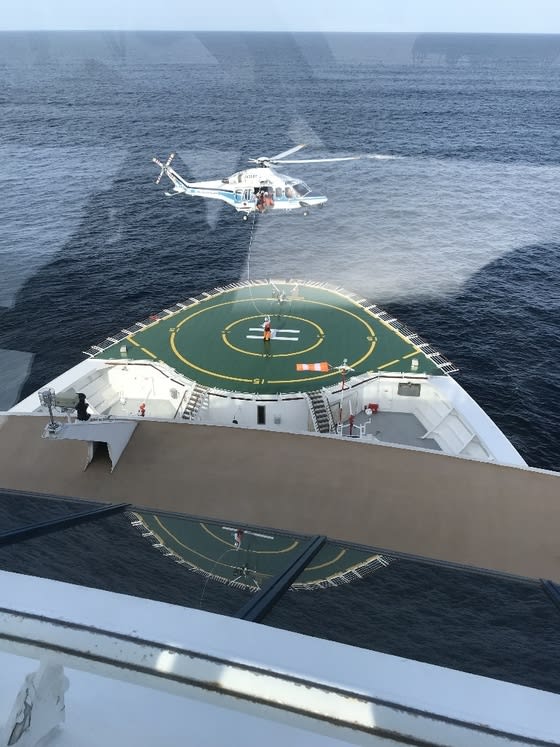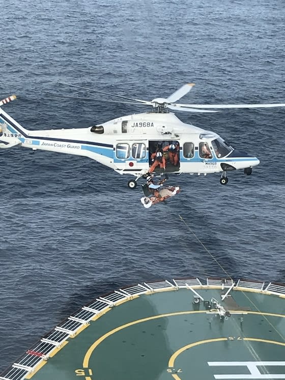 私もこの救出活動見てました。 以前に飛鳥IIでも同じ様な光景を見た事があります。 飛鳥IIはヘリポートが無いので、ヘリがずっとホバーをしながら急病人をロープで釣り上げていたのは理解できるのですが、このミレニアムは船の先端手前にちゃんとヘリポートがあって、ヘリが来る前に周りの柵条の手摺り?も全て解放して完全フラットにして準備していたのに、ヘリコプターはそこに着艦せずにホバーのまま。救護の隊員がロープで降りてきてまず荷物から、そして急病人の奥さんらしきご婦人を釣り上げ、最後に急病人の担架を釣り上げてました。 これを見て「なんでホバーなの?」って思ったのですが如何思われますか? 船は完全に停止して波も穏やかでヘリポートに降りれない理由は考えらませんでした。急病人もその奥さんもあのロープで釣り上げられるのは相当キツかったのではと思います。私自身若い頃に消防訓練で10m位をオリローで降りた時もキツかったですから、ましてや恐らく60代以上の年齢の方がロープで釣り上げられるのは楽では無かったと思います。 あれは救助隊が訓練代わりにわざと着艦しないで遂行したとしか思えませんが・・・?