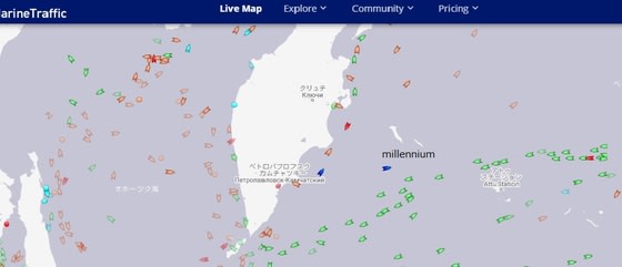 カムチャッキーに近い客船表示青の船は、アザマラクエストと思われる。