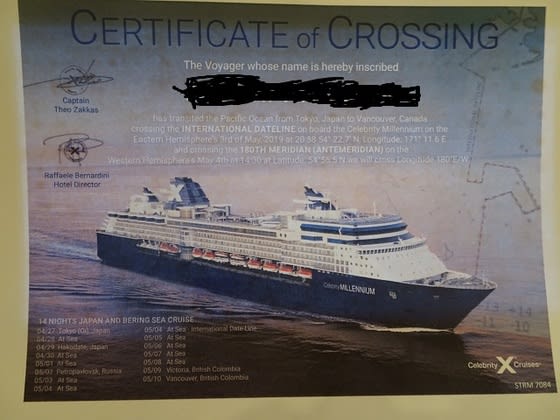 下記は、船長の「日付変更線」通過証明書