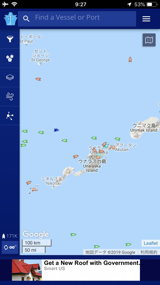 本船は、ベーリング海より、アリューシャン列島の北米よりのウナラスカ島を抜け、アラスカ海に至る。
