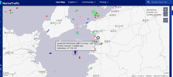 現在のダイヤモンドプリンセスの位置。