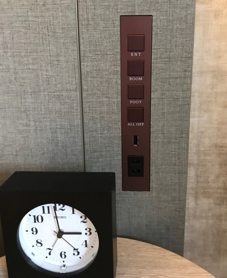 ベッドサイドにもUSB、電源口があり便利。置き時計の目覚ましも段階音量ですぐに起きました。