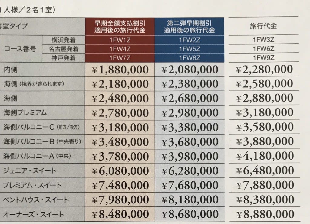 出発の約1年前に全額を支払うと40万円引きになる計算で、他の部屋の料金も一律40万円引きとなっています。そのほかに第二弾早期割引も設けられています。
