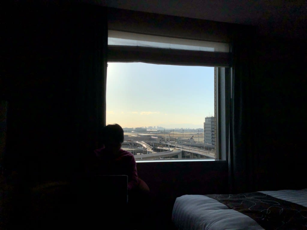 窓の外は羽田第一ターミナルの滑走路と富士山がうっすら見えて、離発着する飛行機をいつまででも見ていられます。