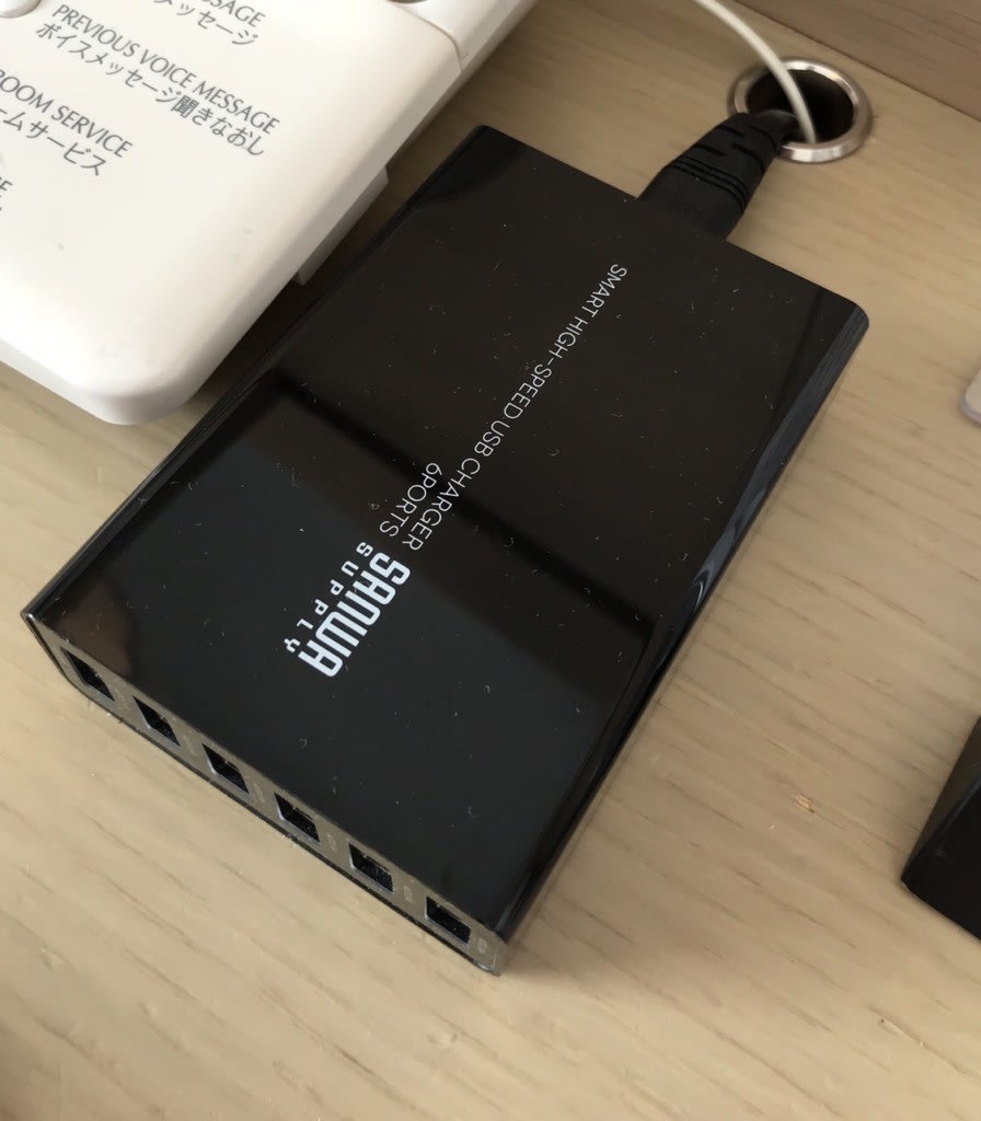 ベッドサイドには6口のUSBハブが!とにかくいつも旅先では主人と充電争奪戦になるのでありがたいです。