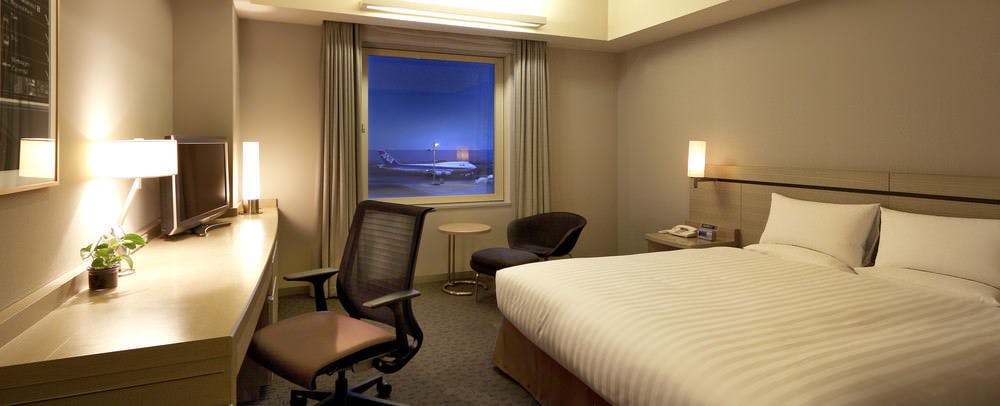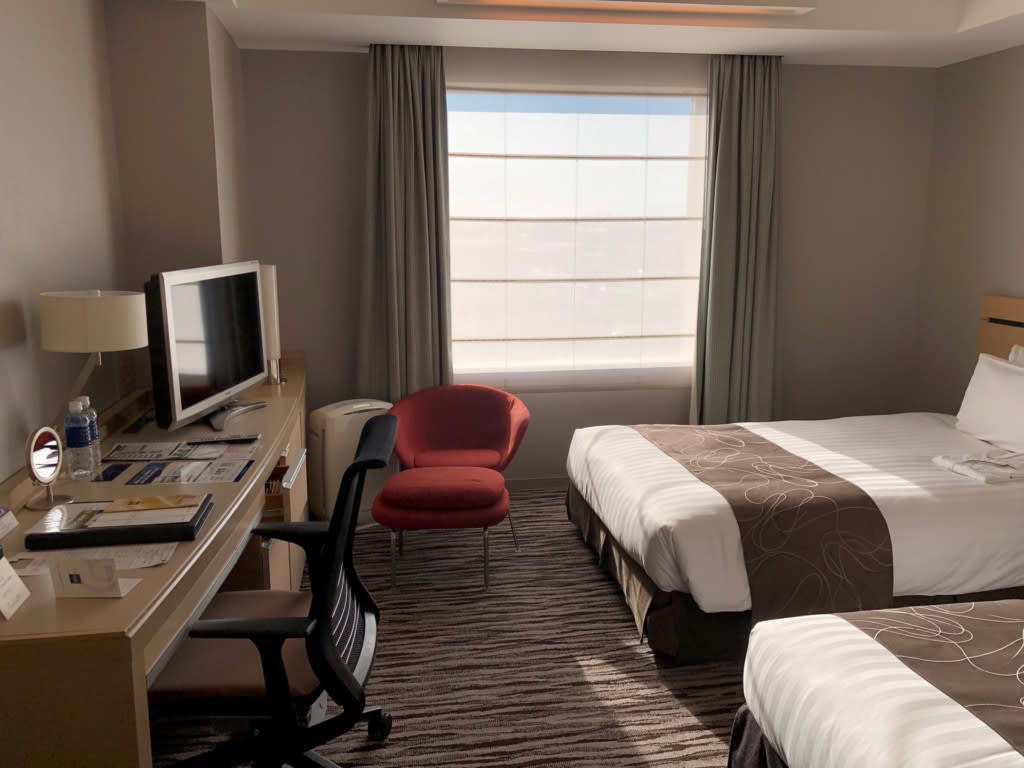 茶色を基調とした23平米のスタンダードツイン。ベッドの幅も十分で前泊には勿体無いくらいにゆとりのあるお部屋です。