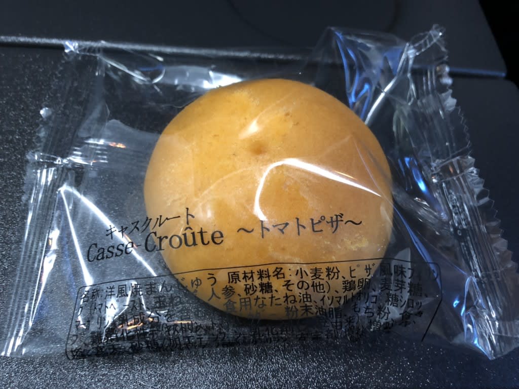 到着間際にようやくお腹も落ち着き軽食が出てきたピザパンとやらは、東京銘菓ひよこの皮にピザ餡が入っているようななんとも不思議な味で想像とは違った食べ物にちょっとがっかり…。もっと普通な食べ物でよかったのに…。