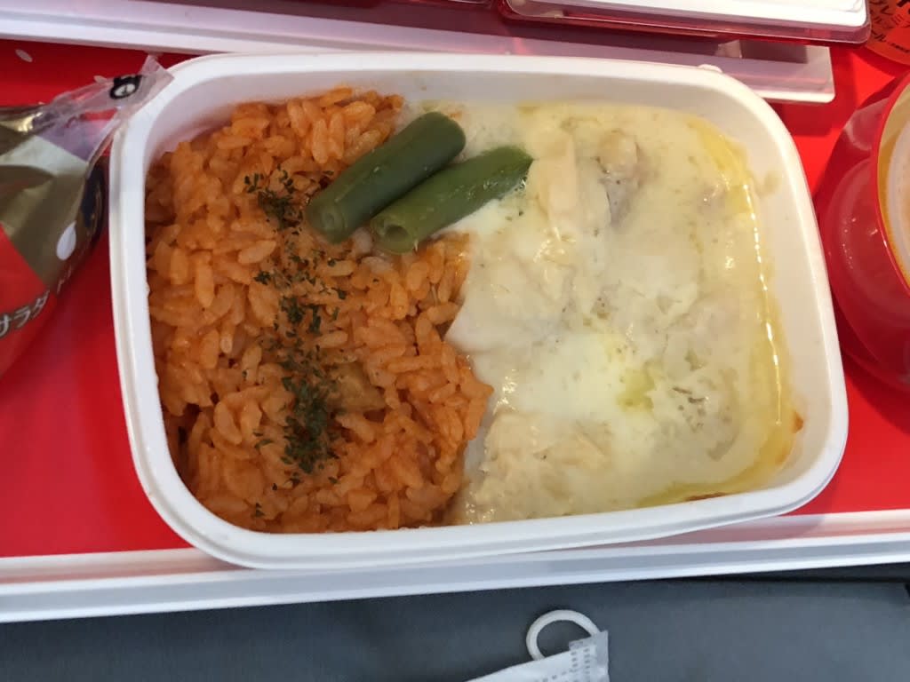 機内食が配られるタイミングで、なんだかお腹がゴロゴロし始めました。腹痛というよりガスがどんどん溜まってくる違和感でこの機内食はグラタンソースを何口かすくっただけ、でした。