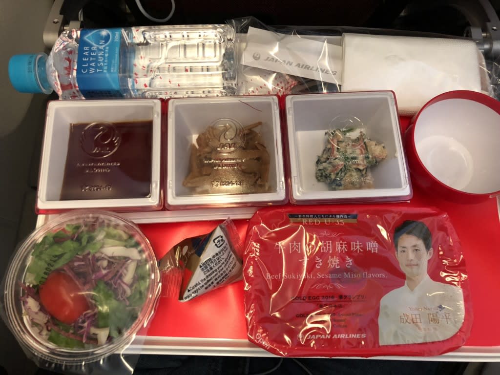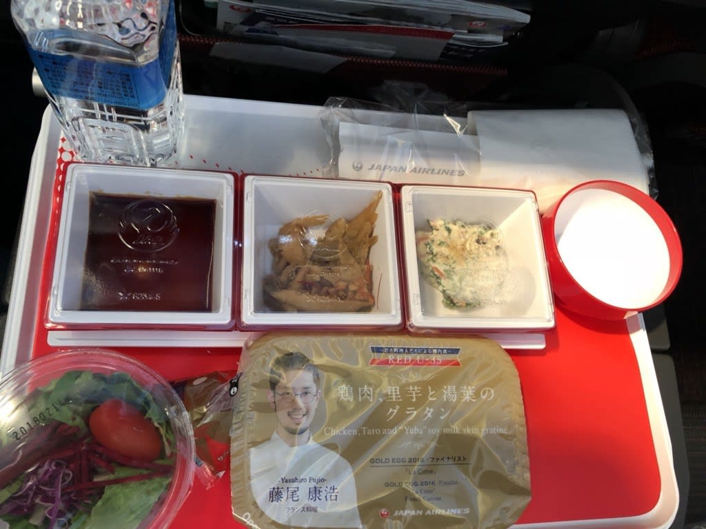 機内食は牛肉の胡麻味噌すき焼きまたは鶏肉、里芋と湯葉のグラタンの2種類のメインで、そのほかの副菜やサラダは同じものでした。