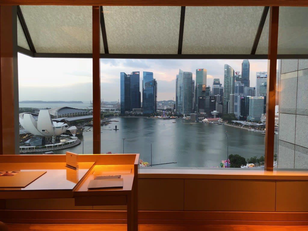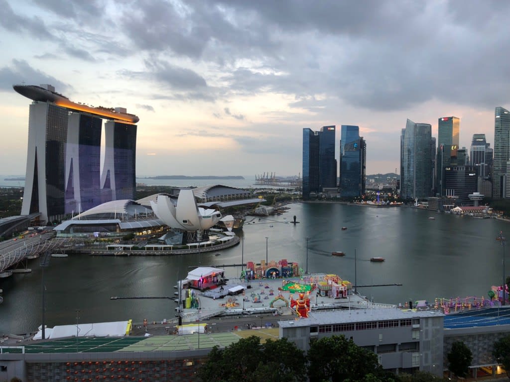 部屋のドアを開けると、マリーナベイ(湾)の周りのマリーナ・ベイ・サンズやマーライオン、ビル群、ホテルが一望できる素晴らしい眺めでした。