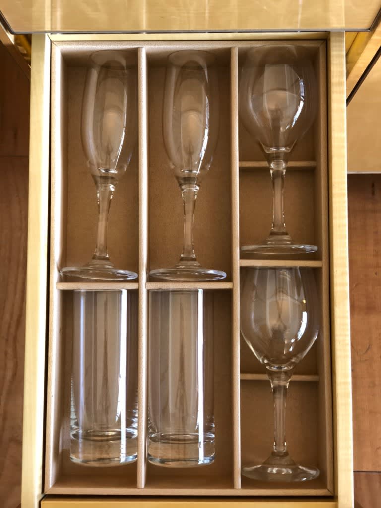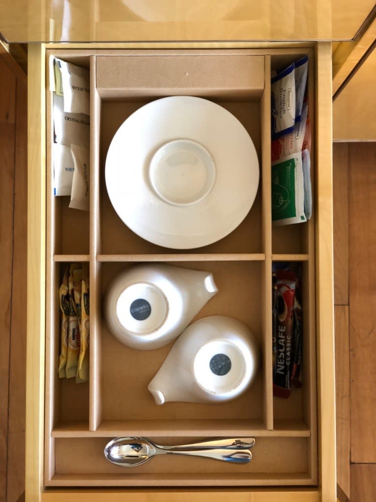 テレビモニターしたのキャビネットの上には有料スィーツがあり、キャビネット内にはグラス類、冷蔵庫、電気ポットが収納されていました。