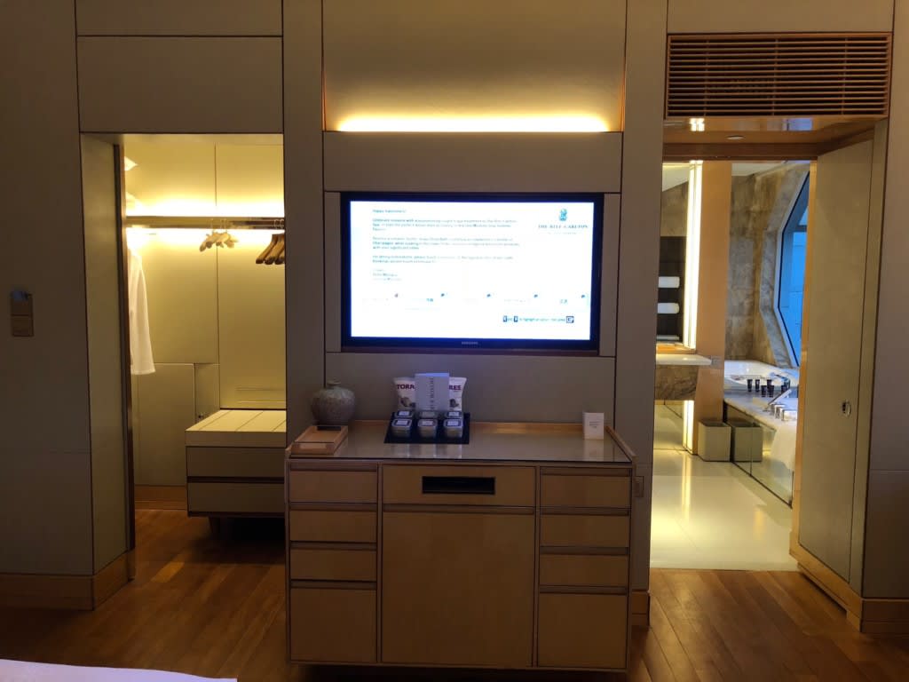 壁際には大きなテレビ画面が設置されていて、ホテルのサービス、施設案内もこちらで見ることができます。紙の案内書はありません。