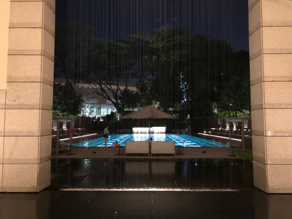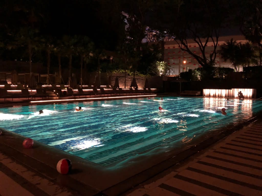 日が落ちても外は蒸し暑い!シンガポールは東京の”梅雨があけたばかりの夏”、みたいな気候でした。夜になっても気温はそんなに下がらないので夜遅くまで泳ぎを楽しんでいました。