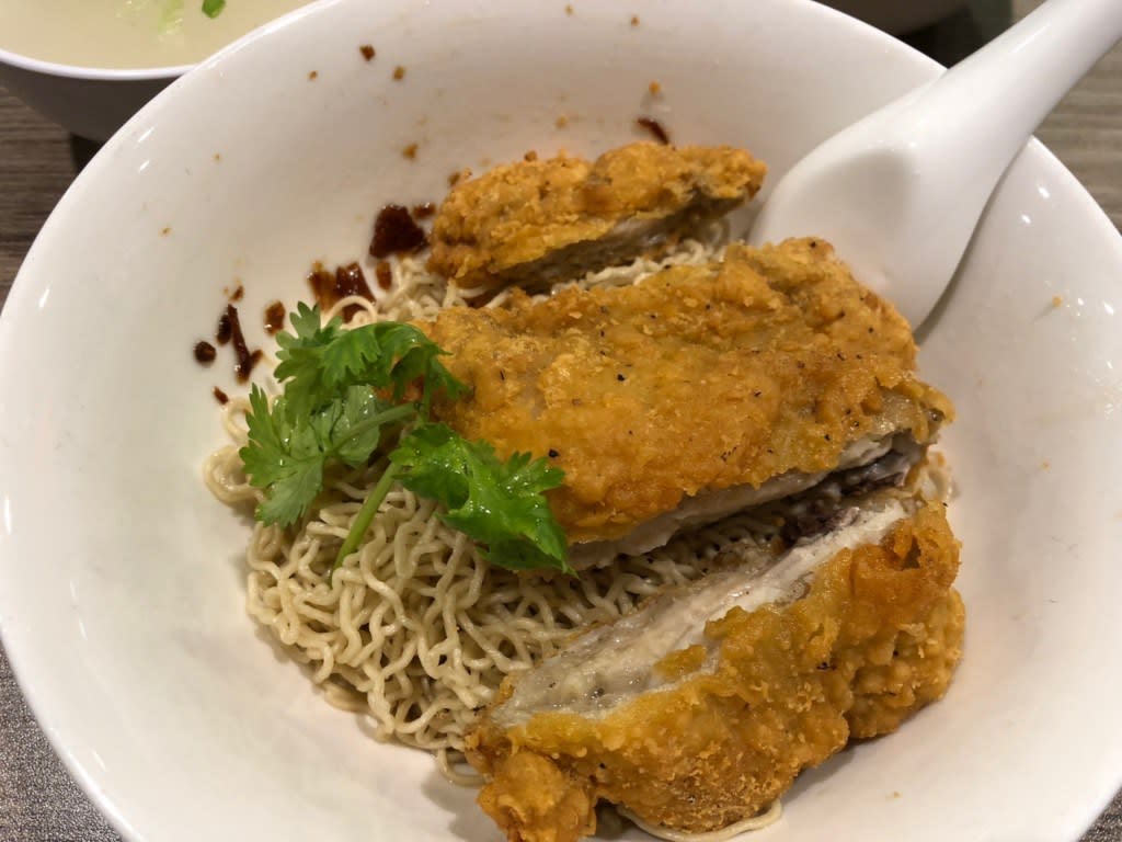 主人はフライドチキンがのった汁なし麺。見た目よりチキンが美味しくて驚きでした。