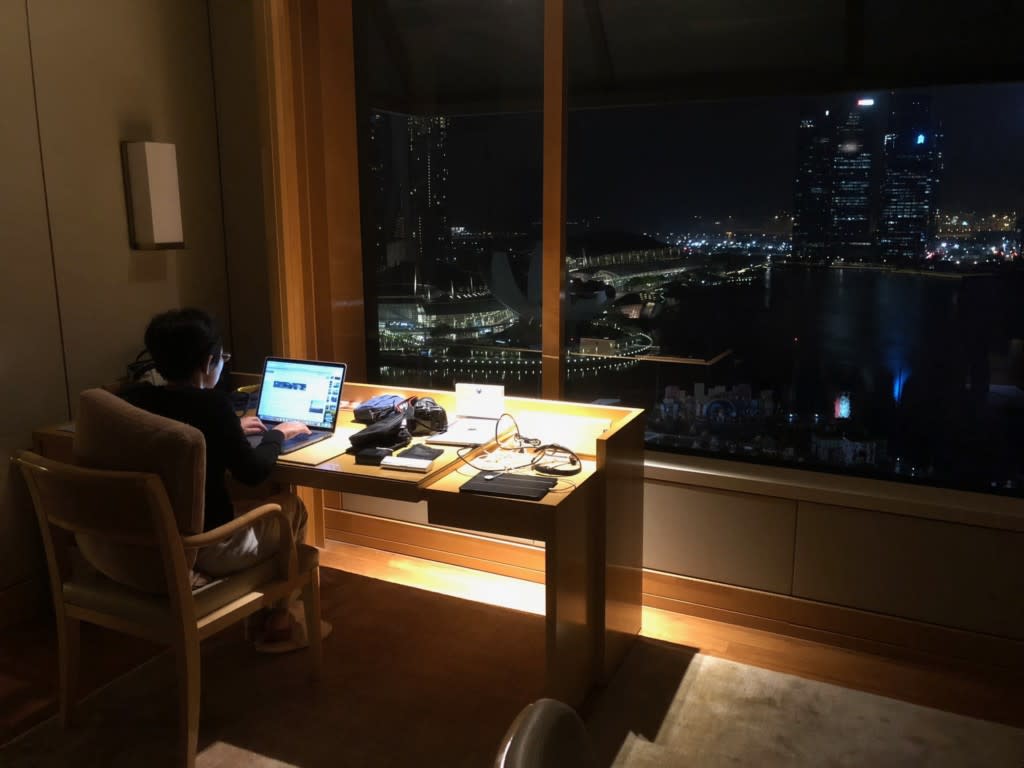 いつも目がさめる時間に起きてブログ更新中。6時半位だったと思いますが外は真夜中の風景です。