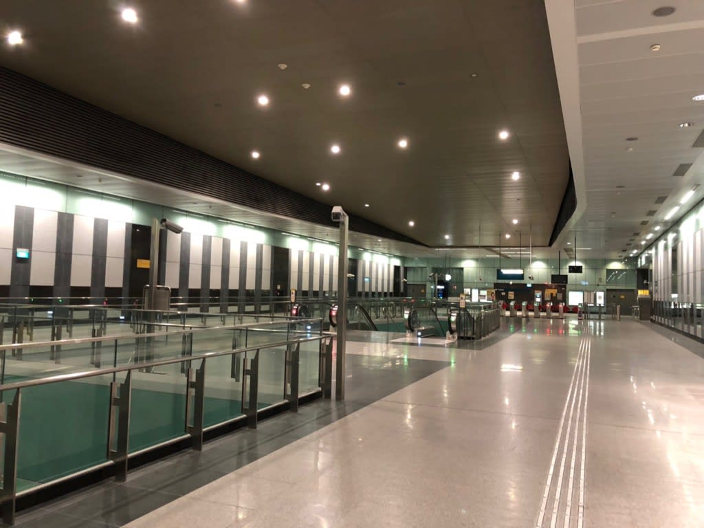 マリーナサウスピア駅の構内も広くて綺麗です。平日昼間とあって閑散…というか誰もいません。