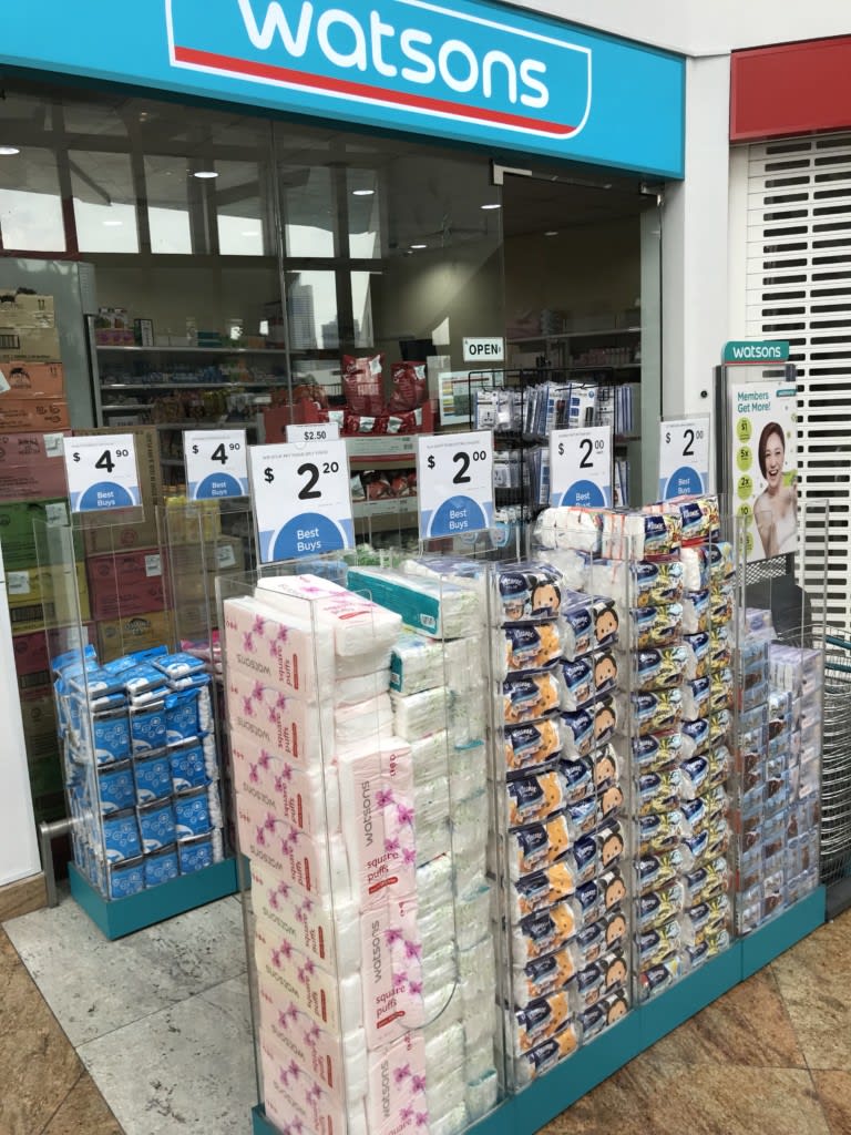 アジアでお馴染みワトソンズのミニミニ店がありました。推し商品は、ポケットティッシュと男女紙パンツのようです。買う人が多いのでしょうか?店内を除くと、化粧品などの類よりはもっと変換プラグなどトラベルショップ的な商品が多かったです。