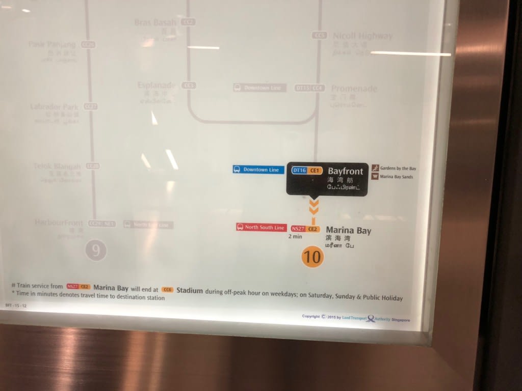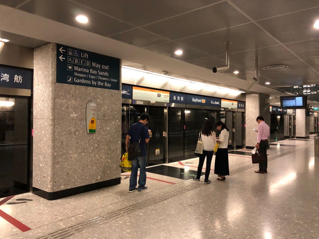 ベイフロント駅で地下鉄を待ちます。シンガポールの地下鉄、本当に綺麗です。