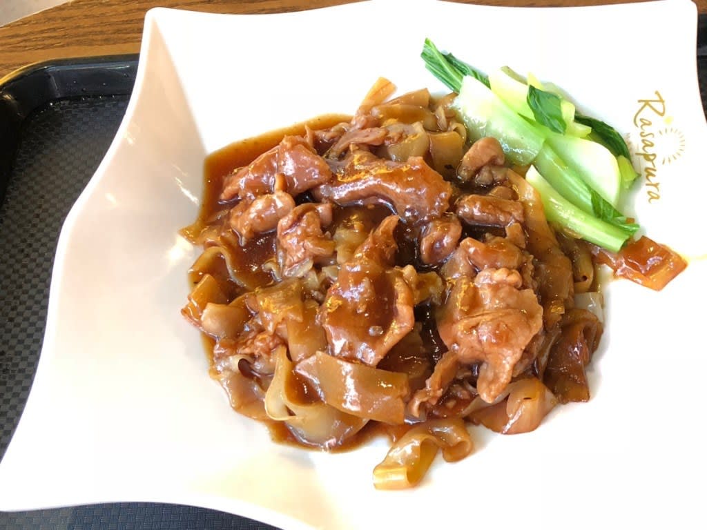 暑さで食欲がなく私は牛肉と平たい麺の甘めのソースがけ。見た目想像通りの味である意味「ホッ」とします。こちらはスモールサイズで7ドル弱。