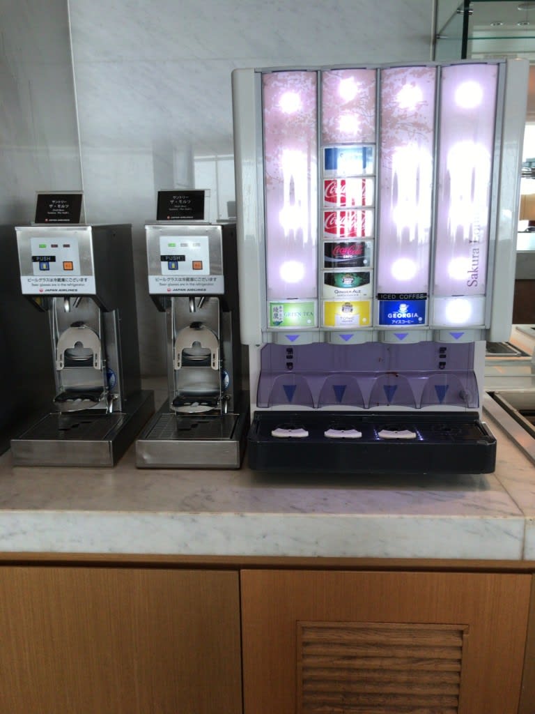 成田空港第2ターミナルで出国審査を受けて出てすぐにJALファーストクラスラウンジ・サクララウンジの入り口がありました。入ってすぐの2階はアルコール、ソフトドリンク、おつまみが置いてあるラウンジとなっていました。