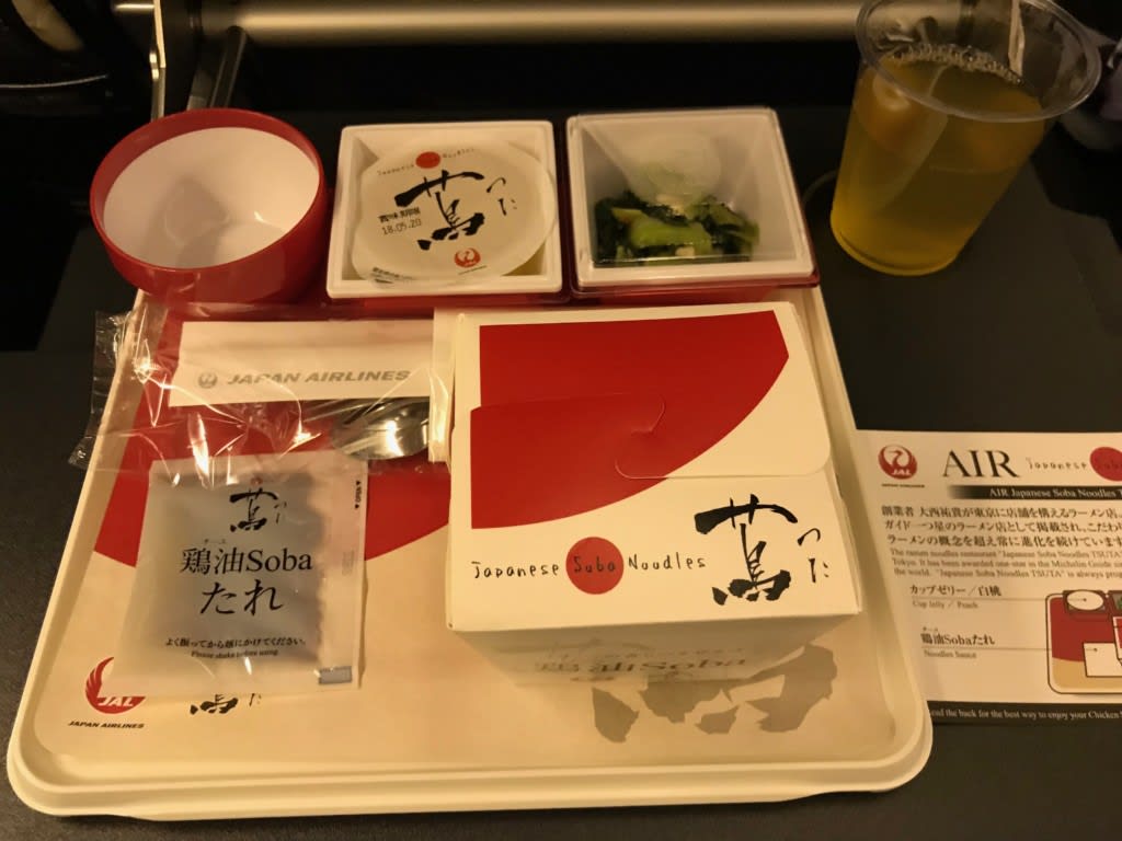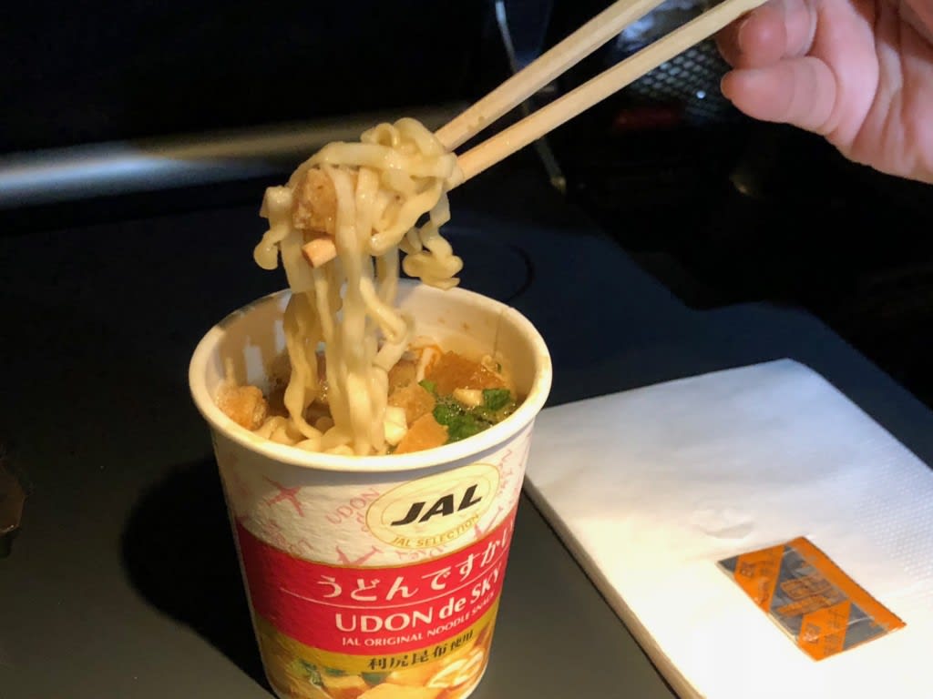 到着前に(日本時間だと真夜中)最後の軽食、鶏油(チーユ)sobaが出ました。これ、すごく美味しかったです!