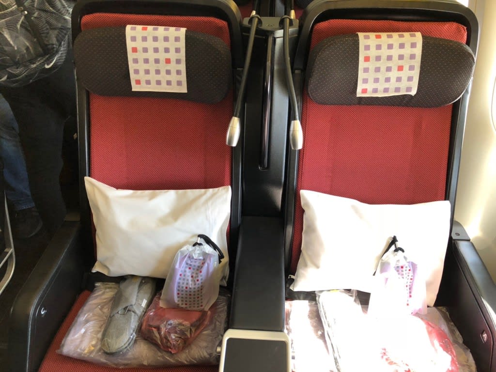 プレミアムエコノミー席は40席あって、窓際2列、中央4列という並びでした。私たちは窓際の2席でした。2席だとお手洗いへの行き来が楽でそれだけでも嬉しいし、安心。