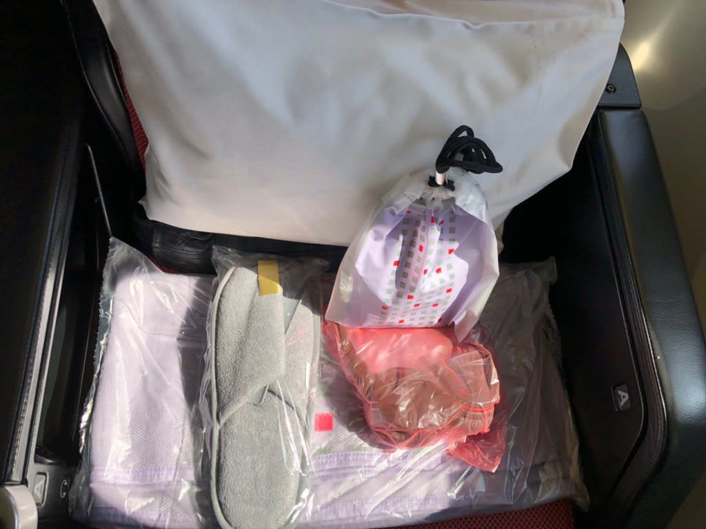 座席にはスリッパ、ヘッドフォン、アメニティーグッズ(歯ブラシ、アイマスク、耳栓など)が置かれていました。家から持ってきた歯ブラシよりこちらでもらったJALの歯ブラシの方が良かったでクルーズ旅行中は愛用していました。