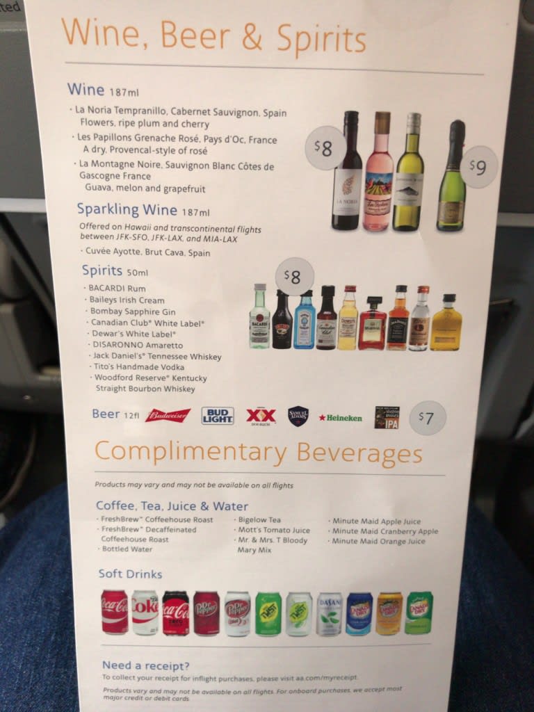 シカゴから3時間半のフライトですが、機内サービスはソフトドリンク以外は無料です。搭乗口付近でミネラルウォーターを買って乗ったので私は機内サービスのドリンクをもらいませんでしたが、お水を飲んだ主人は「すごくマズかった」と言ってました。