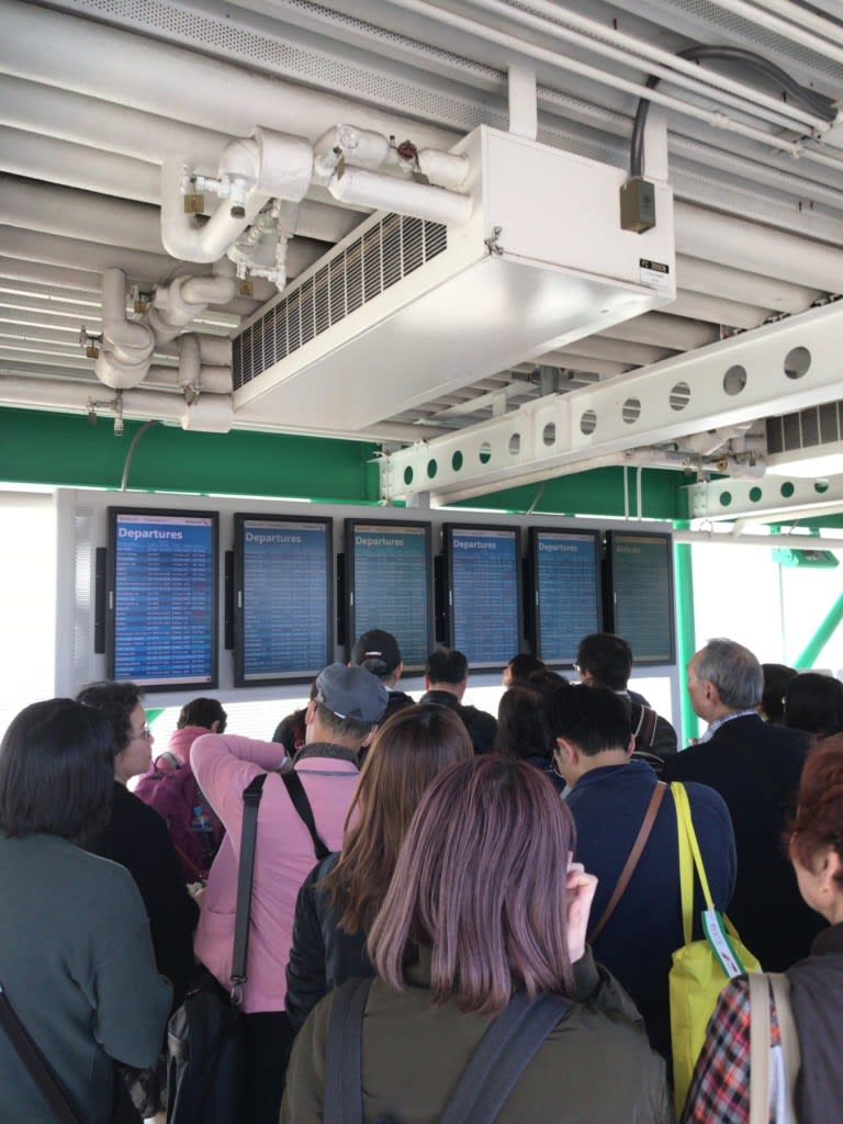 出発便の搭乗口を表示するモニターの見方を添乗員さんから教わっています。日本だと出発時間の時系列で表示されますが、ここでは到着地名のアルファベット順で表示されています。