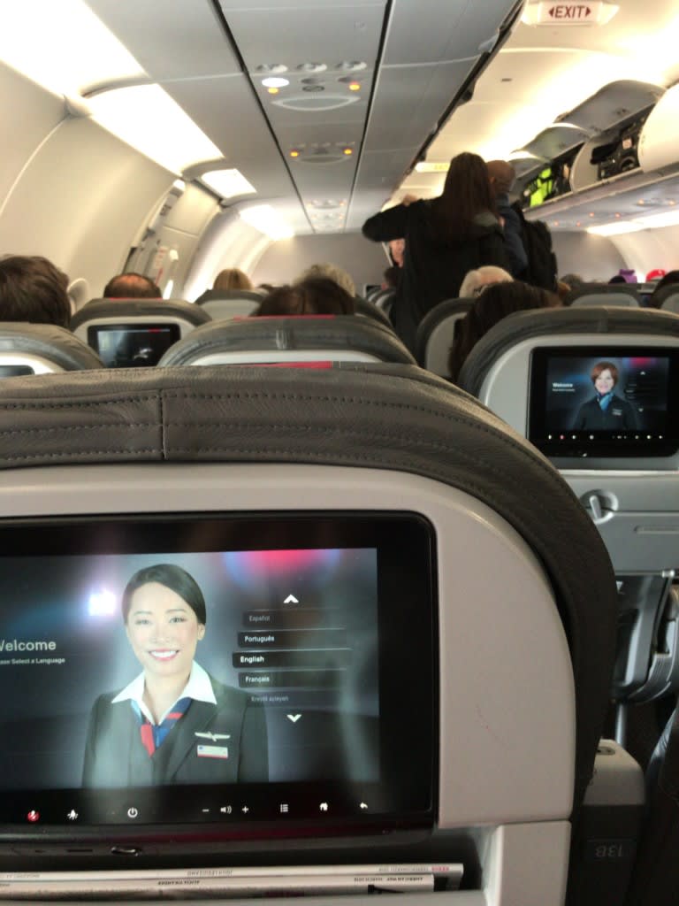ようやく国内線のアメリカン航空へと搭乗しました。国内線はエコノミー席です。3人席が2列の狭い機内。ここではツアーの人皆んなバラバラで、私も両隣が外人さんでした。
