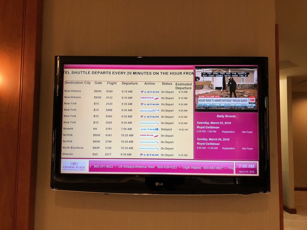 ホテルのロビーには出発便の状況がみれるモニターがありました。見方はシカゴ空港で教えてもらったように到着地アルファベット順です。